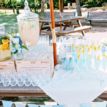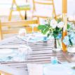 パラソルテーブルにはレースペーパーのランチョンマットにブルーのナプキンでコーディネイト