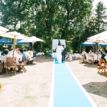 ブルーのバージンロードは色が映えるように白い布の上に敷きました。挙式リハーサルでのお父様と新婦の第一歩目。新婦が歩んできた道のりをあらわすためゆっくりと歩いていただきます