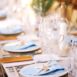 同時に会場では着々とテーブルのセッティング。試食の時にお二人と打ち合わせして決めた海のビーチをイメージした水色のナプキンと新婦手作りのメニュー表、卓番号が入った瓶をコーディネイト